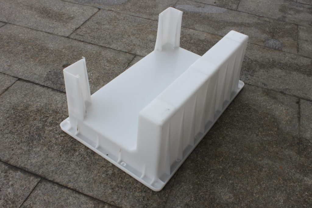 此款擋渣塊防撞型路牙石模具所用原料為聚丙烯樹脂,經(jīng)注塑機(jī)高溫熔解后在鋼模具內(nèi)成型完成。乍一看似乎樣子有點(diǎn)奇怪,其實(shí)所澆筑水泥防撞路牙石呈L型,模具底部的兩個(gè)腳為支撐柱,方便實(shí)際擋渣塊、擋土塊的澆筑過程。為保障防撞路牙石模具的使用耐久性,更是在受力兩面增加了十六條加強(qiáng)筋,有效提升重復(fù)使用次數(shù),節(jié)儉生產(chǎn)成本。