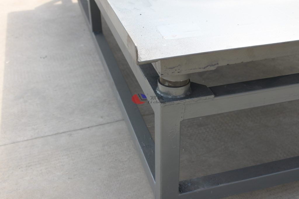 對(duì)于尺寸規(guī)格較大的水泥制品模具,在澆筑過程中不方便將模具內(nèi)的空氣,以及混凝土在模具中的均勻攤平,通過使用振動(dòng)臺(tái)來將內(nèi)部空氣排放和混凝土的振實(shí)。振動(dòng)臺(tái)四個(gè)臺(tái)腳處都設(shè)計(jì)上了墊腳,在震動(dòng)過程中能保持平衡。