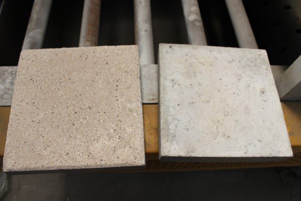 1.先使用塑料模具來澆筑成型的混凝土彩磚,對于預(yù)制成型的混凝土彩磚進(jìn)行模具的脫模,放置一旁得以備用,下面這張圖是主要能更清楚的看出使用混凝土路面拋丸機(jī)后的水泥磚表面。